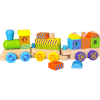 Three part, wooden, painted train. Different colour and shaped blocks. Aids in learning Shapes, Colours, Reasoning, Motor Ability and Hand-eye co-ordination.