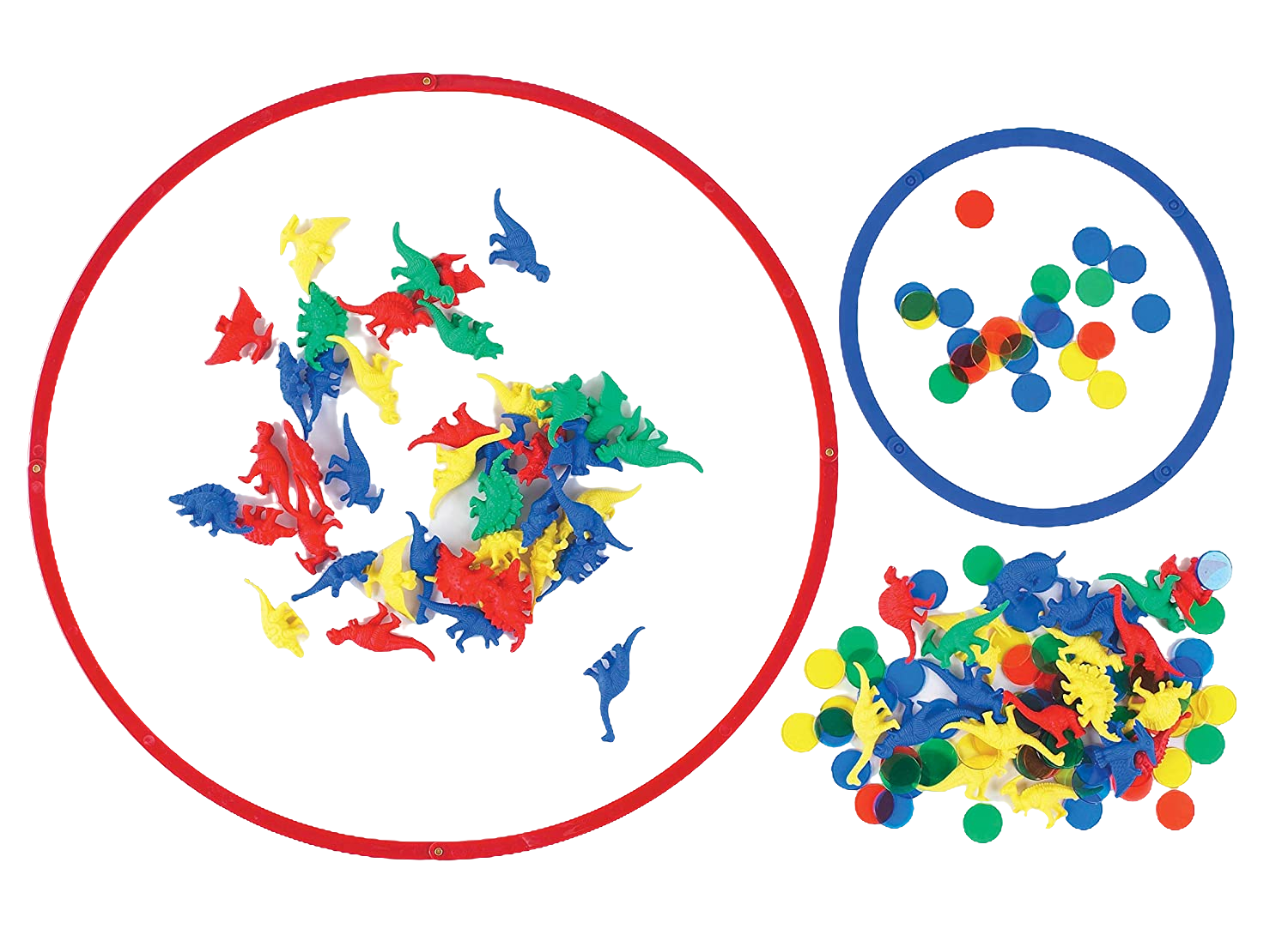 Small folding sorting rings ideal for tabletop use, to help children classify and count objects. Use singularly or create Venn diagrams for sorting, comparing and attribute work. Set of 15, 5 each of red, yellow and blue.